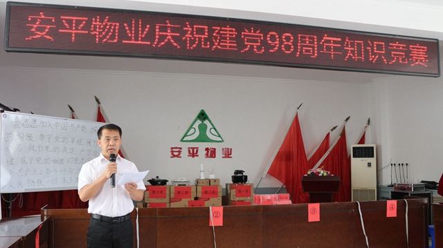 火紅七月,流光溢彩。2019年7月12日下午,安平集團(tuán)會(huì)議室內(nèi)人頭攢動(dòng),熱鬧非凡。“學(xué)習(xí)強(qiáng)國,閱讀興遼”安平物業(yè)杯慶祝中國共產(chǎn)黨建黨98周年知識(shí)競(jìng)賽在這里如期舉行。集團(tuán)領(lǐng)導(dǎo),部分中層干部、一線員工近百人參與了活動(dòng)。
