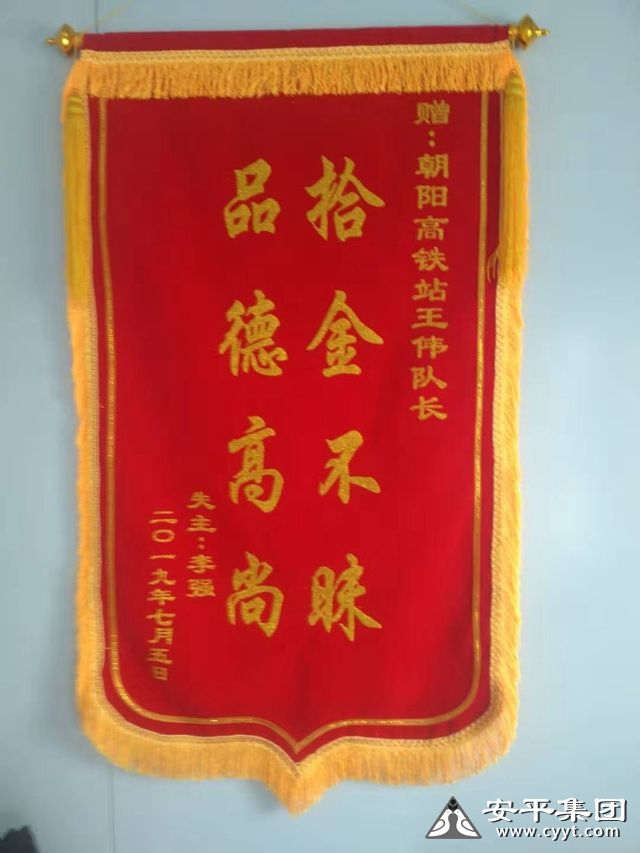 2019年6月10日,王偉執(zhí)勤期間在送客區(qū)拾到錢夾一個,內(nèi)有身份證和銀行卡共計12張及現(xiàn)金755元,通過鐵路公安處聯(lián)系到失主李先生,及時將失物交還給他。2019年7月5日,李先生將一面寫有“拾金不昧,品德高尚”的錦旗專程送到高鐵站,感謝王偉及全體保安員。