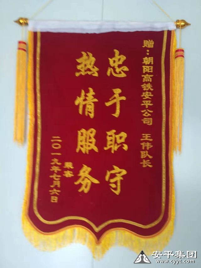 2019年7月6日,王偉在執(zhí)勤中發(fā)現(xiàn)一下車乘客步履蹣跚行動不便,隨即帶領員工到站內(nèi)借用殘疾車一路攙扶護送至待客區(qū)乘車處將旅客扶上車,家屬趕來時正好目睹了這感人一幕。感動之余,對王偉這一做法給予了高度評價,事后又專程到高鐵站敬獻錦旗一面,感謝安平集團保安員耐心、周到、熱情的服務。