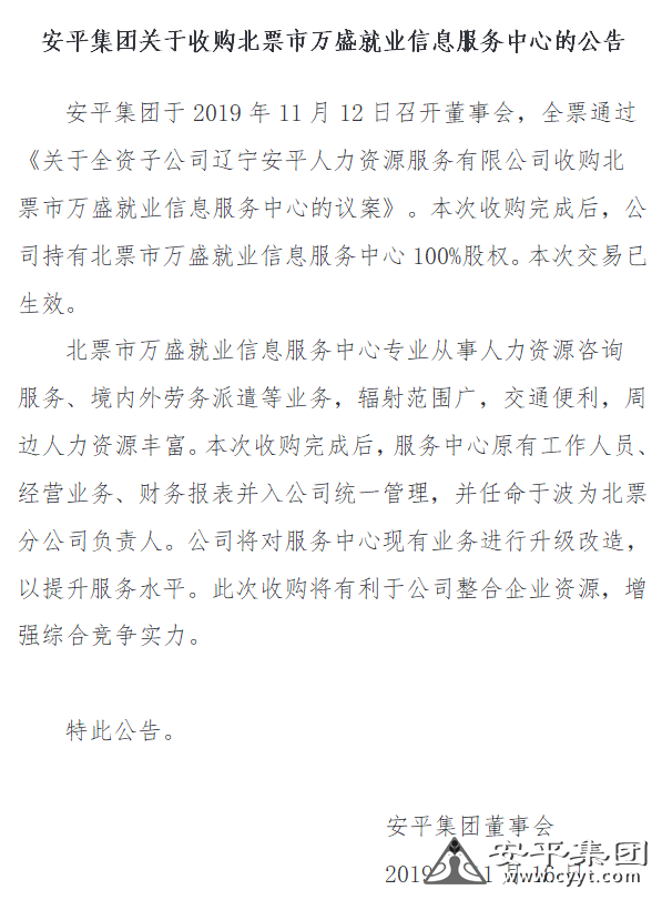 【重要公告】安平集團關(guān)于收購北票市萬盛就業(yè)信息服務中心的公告