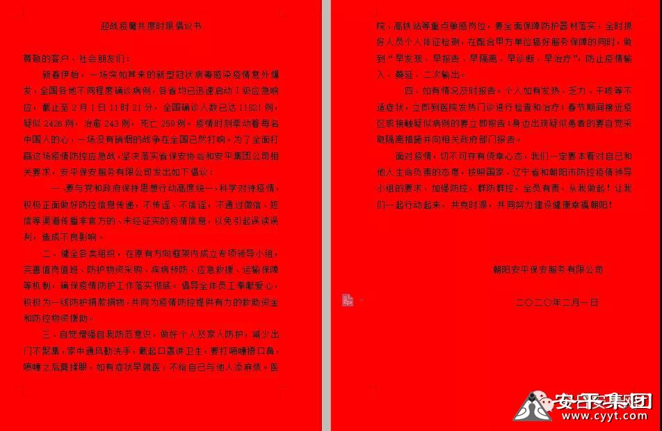 為最大范圍阻擊疫情,充分發(fā)揮群眾力量,同時(shí)有效開展疫情預(yù)防工作,安平保安公司向所有客戶、業(yè)主發(fā)出倡議書,倡議大家要本著對自己和他人生命負(fù)責(zé)的態(tài)度,按照國家、遼寧省和朝陽市防控疫情領(lǐng)導(dǎo)小組的要求,加強(qiáng)防控,群防群控,全員有責(zé),從我做起!讓我們一起行動起來,共克時(shí)艱,共同努力建設(shè)健康幸福朝陽!
